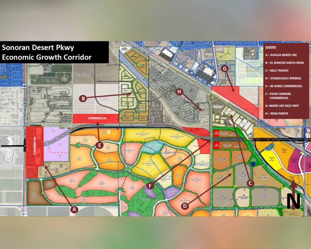 The East-West Corridor (now the Sonoran Desert Parkway) project is part of the RTP and involves construction of a 21-mile corridor of new and existing roadways beginning at State Route 347 in the city of Maricopa and extending east through northern Casa Grande to Interstate 10. When it became clear funding from this tax would not be forthcoming, the city moved to fund this regional corridor with developer impact fees (not citizen-paid taxes). Impact fees are charged to contribute to costs associated with infrastructure and public services that need to be expanded as a direct result of new development in the growth areas of the city of Maricopa, as defined in the General Plan.